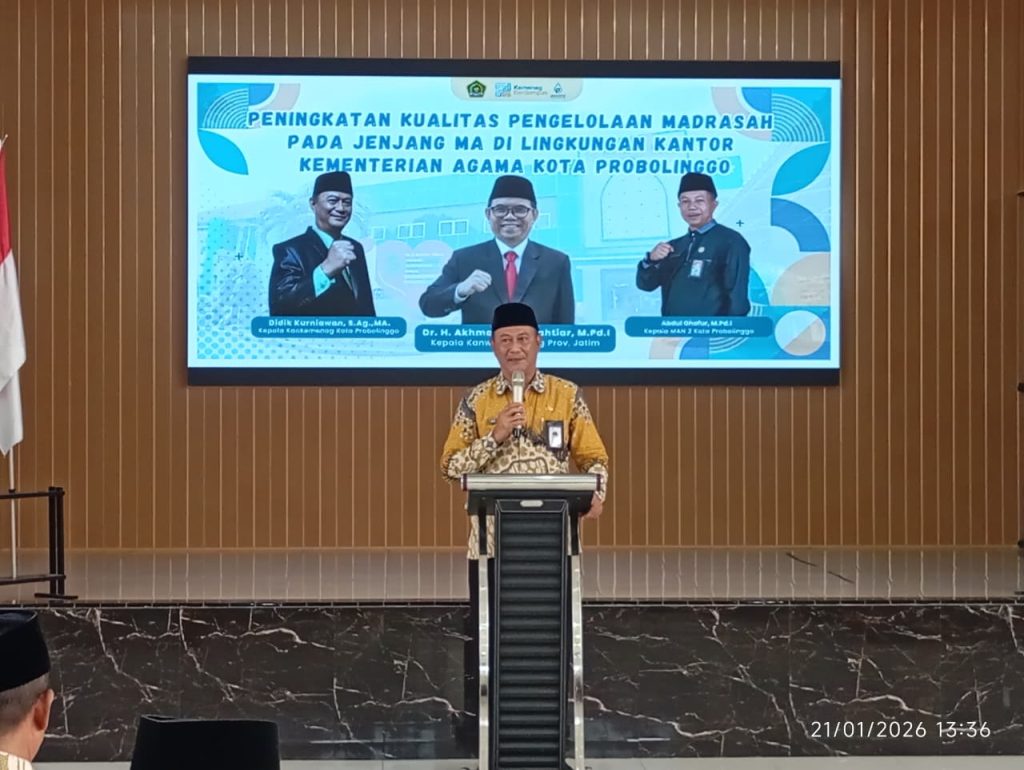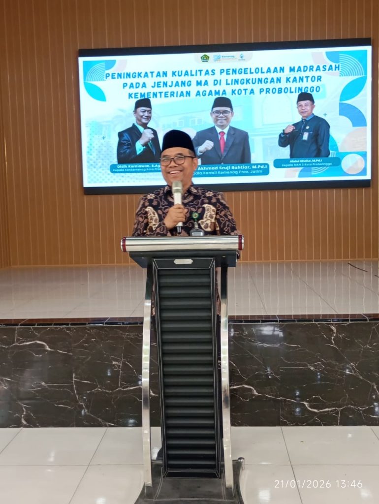 MandaProExist-Aula MAN 2 Kota Probolinggo menjadi pusat penguatan mutu pendidikan melalui kegiatan “Peningkatan Kualitas Pengelolaan Madrasah Jenjang Aliyah (MA)” dilingkungan Kantor Kementerian Agama Kota Probolinggo hari ini (21/01/26). Acara ini dihadiri langsung oleh Kakanwil Kemenag Provinsi Jawa Timur, Dr. Akhmad Sruji Bahtiar, M.Pd.I. Turut mendampingi, Kepala Kantor Kemenag Kota Probolinggo, Didik Kurniawan, S.Ag., M.A., beserta jajaran Kasubag TU, para Kasi, serta seluruh Kepala MA Negeri maupun Swasta se-Kota Probolinggo. Kehadiran para Kepala Tata Usaha, guru, dan staf karyawan MAN 2 Kota Probolinggo pun turut menyemarakkan suasana.